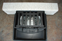 CENTRIFOEL®-Gerät als Straßenablauf (Gully) in einem Industriegebiet, mit höhenverstellbarem Adapter zur Aufnahme von Abdeckungen, in eingebautem Zustand. Für eine Belastung bis einschließlich SWL 60.